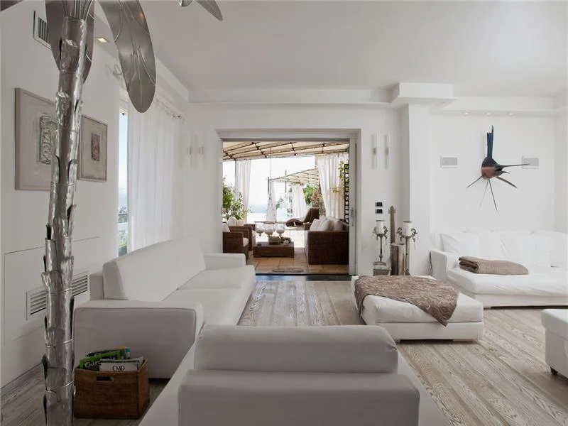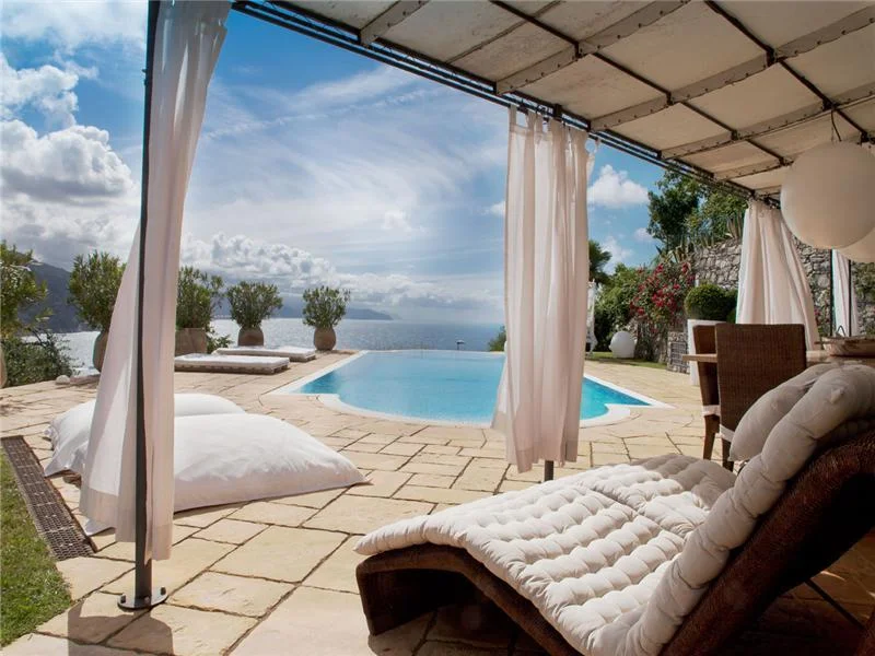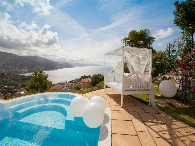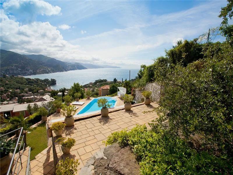 A wonderful property overlooking the sea on the Levante Italian Riviera between Santa Margherita and San Michele di Pagana. The villa was built by the owners as a luxurious oasis of peace and tranquility. The property covers approximately 2500 square meters of terraced land cultivated as a garden with illuminated plants and panoramic swimming pool. The villa is easily accessible via a private road. The main body is composed of a large living area of 100 sqm divided into lounge area, dining area and a small cinema. The living area has whitened oak floors and large bay windows with a beautiful view of the sea. The kitchen has high-tech edge appliances and a large pantry. Walking up the stairs you reach the sleeping area where there are two very spacious bedrooms, each with its own panoramic terrace. The two master bathrooms have designer finishes furnishing studied in detail. The basement has a staff apartment with kitchen, bedroom and bathroom. Always the lower ground floor there is a garage for 4 cars, spacious wardrobe area and a wine cellar. The property has also a dependance in the pool area with living room, kitchenette, bedroom and bathroom. The panoramic garden that surrounds the villa is designed to give every comfort to its guests, from the infinity pool with changing rooms to the barbecue area as well as numerous sunbathing areas. Wire broadcasting throughout the home, aluminum shutters, pedestrian path leading to the beach in 10 minutes.